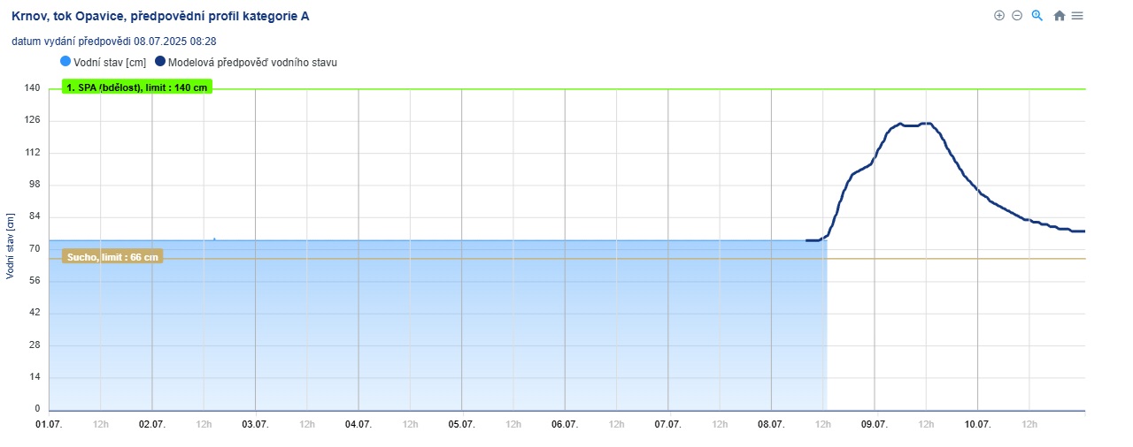 Podle aktuálních informací z ČHMÚ může v oblasti Jeseníků napršet více, ale krajina zatím vodu dobře přijímá. Očekávají se vydatné srážky na straně Javorníku a v Beskydech.