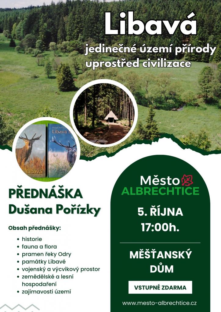 Město Albrechtice a Dušan Pořízka zvou na přednášku s názvem "Libavá - jedinečné území přírody uprostřed civilizace", která se uskuteční ve čtvrtek 5. října 2023 od 17:00 hodin v Měšťanském domě.
