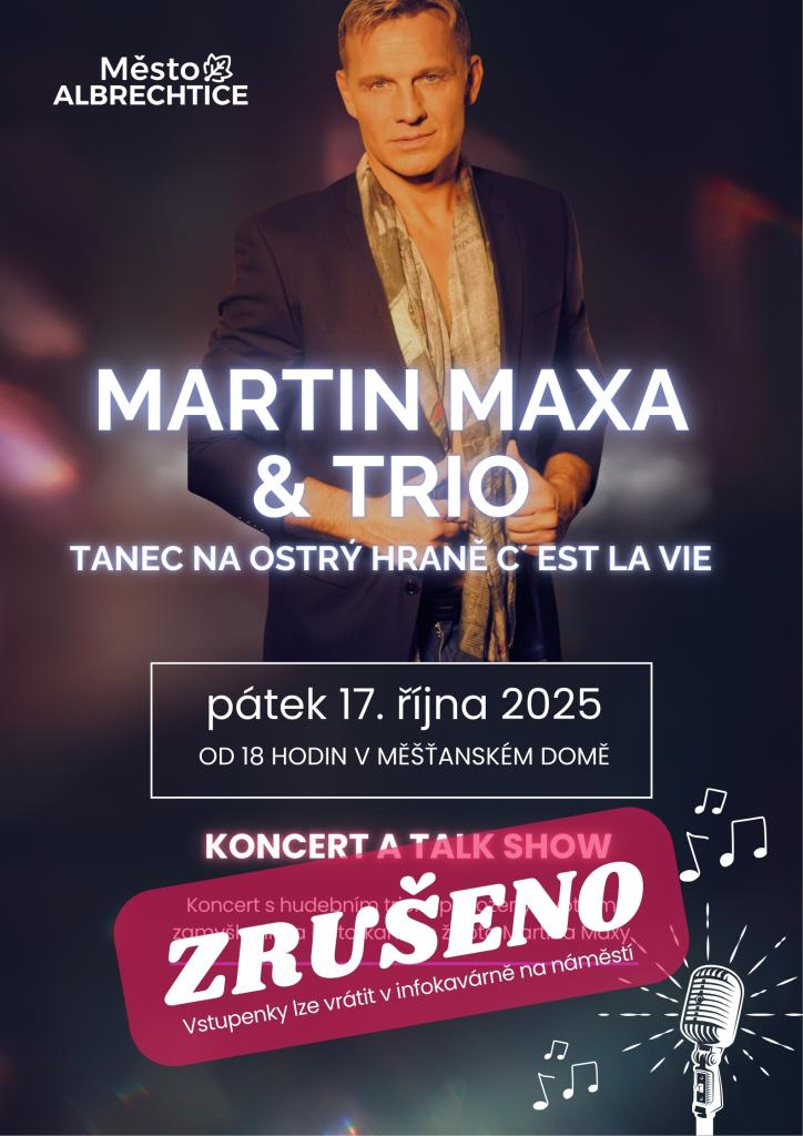 Vážení občané, plánovaný koncert Martin Maxa & Trio – Tanec na ostrý hraně, C´est la vie, který se měl původně konat 10. září 2025 a následně byl přesunut na 17. října 2025, se nakonec neuskuteční.