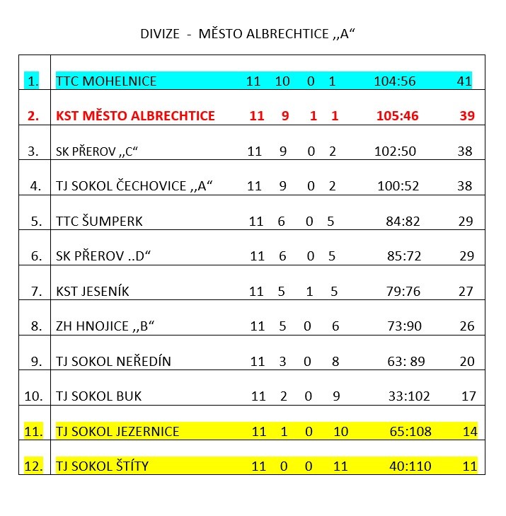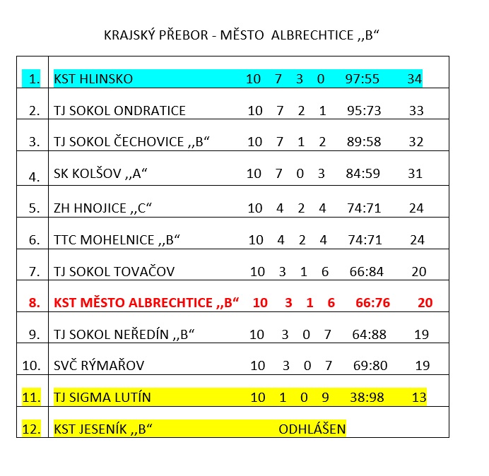 Naše B družstvo hrálo o soutěž níže v krajském přeboru a je zatím na pěkném 8.místě z dvanácti účastníků, poslední Jeseník B se odhlásil ze soutěže a je prvním sestupujícím.