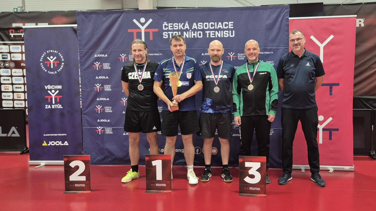 Mistrovství pokračovalo soutěží čtyřher. Jiří s Petrem hráli spolu vůbec poprvé a podařilo se jim postoupit až do semifinále, kde v boji o postup do finále podlehli 1:3. Všechny tři sety prohráli až v koncovkách, což je velmi mrzí,neboť finále nebylo zas tak daleko. Zároveň měli ale obrovskou radost ze zisku bronzové medaile.