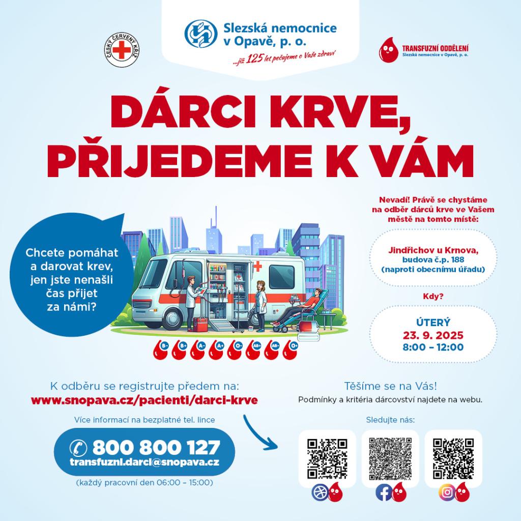 Staňte se dárci krve a pomozte zachraňovat životy. K odběru je nutné se předem registrovat na: www.snopava.cz/pacienti/darci-krve