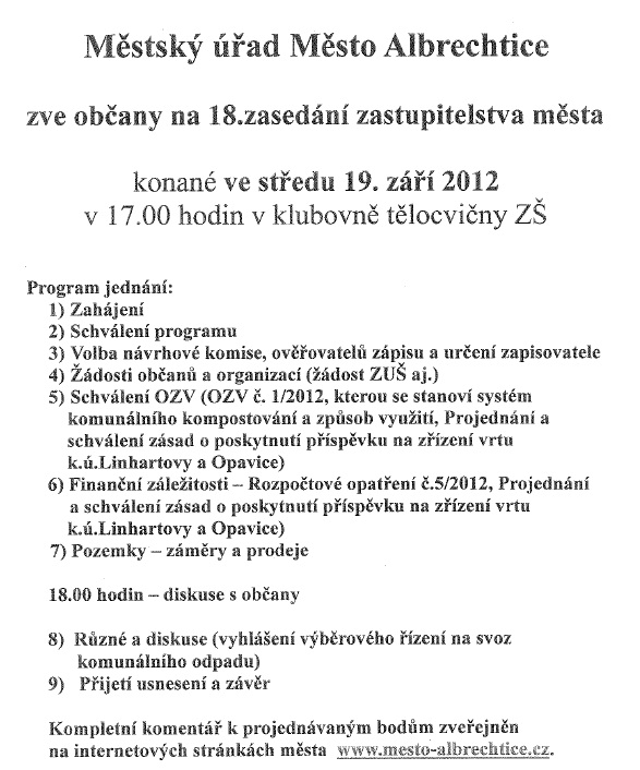19. září se bude konat 18. zasedání zastupitelstva města.