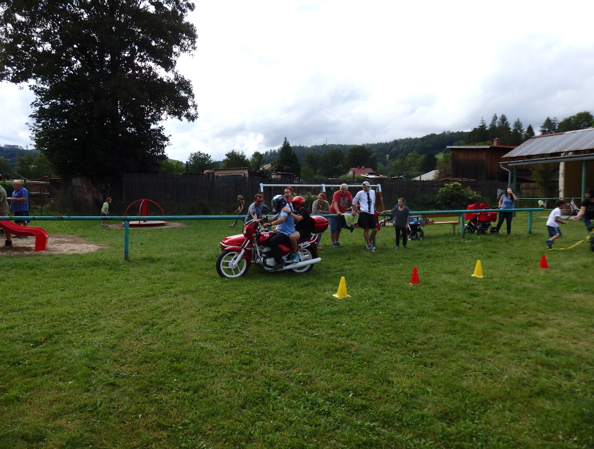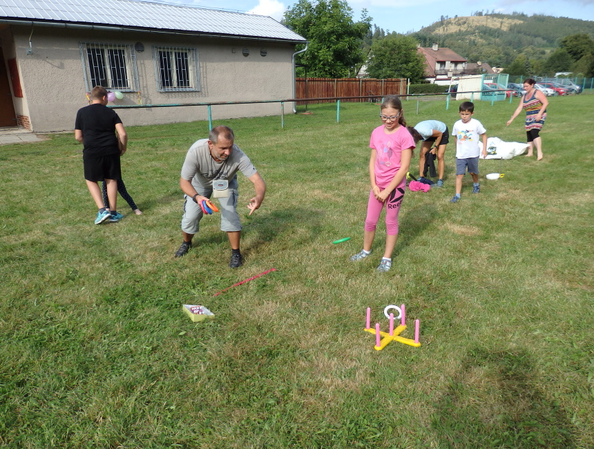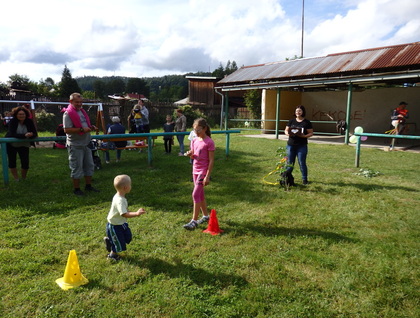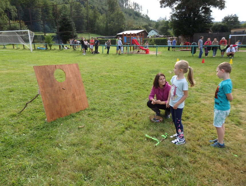 Navzdory rannímu dešti se v odpoledních hodinách rozzářilo slunce a děti si zasoutěžili v hodu šiškou do terče, skákaly v pytli, házely kroužky na cíl a proběhly si slalom s pingpongovým míčkem na lžíci. Za každou soutěž je čekala sladká odměna. V průběhu celé akce bylo připraveno pití a na závěr dostali všichni i špekáček, který si mohli sami opéct na ohni.