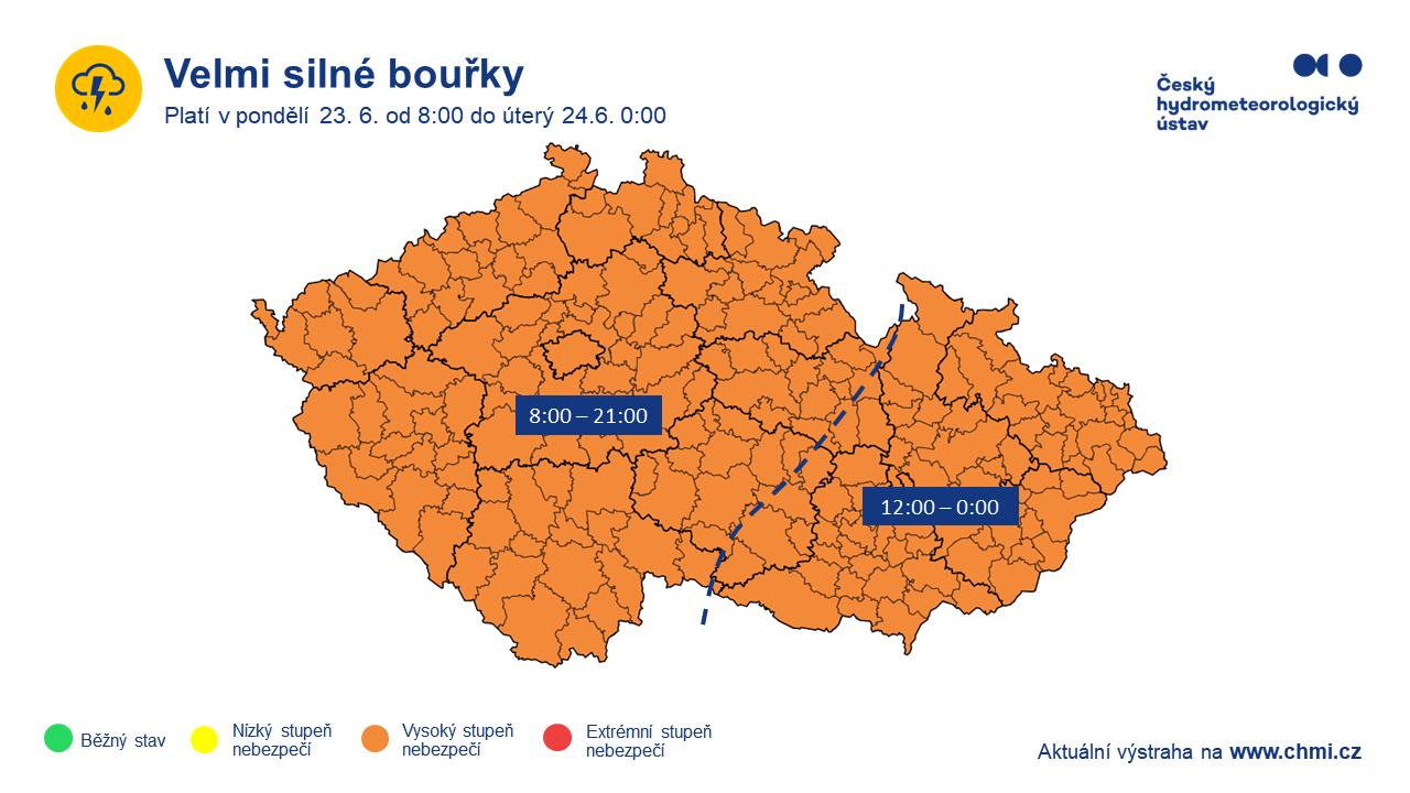 Český hydrometeorologický ústav vydal výstrahu s vysokým stupněm nebezpečí před velmi silnými bouřkami, které mohou zasáhnout naše území v pondělí 23. června v odpoledních a večerních hodinách.