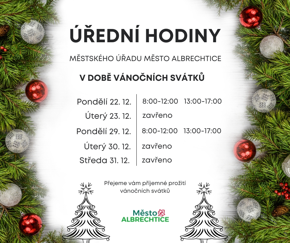 - Pondělí 22. 12. 2025 - úřad bude otevřen (8:00 - 12:00), (13:00 - 17:00)
