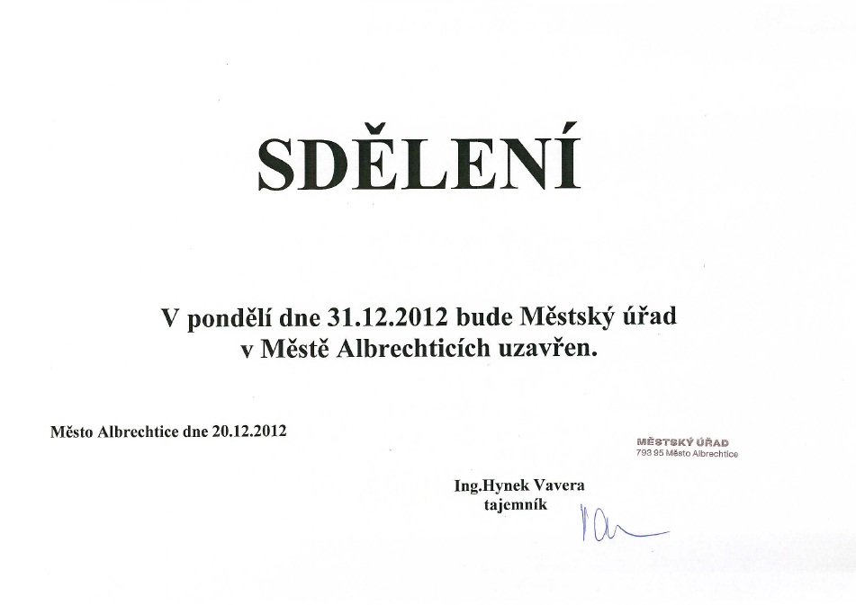 31.12.2012 bude Městský úřad v Městě Albrechticích uzavřen.