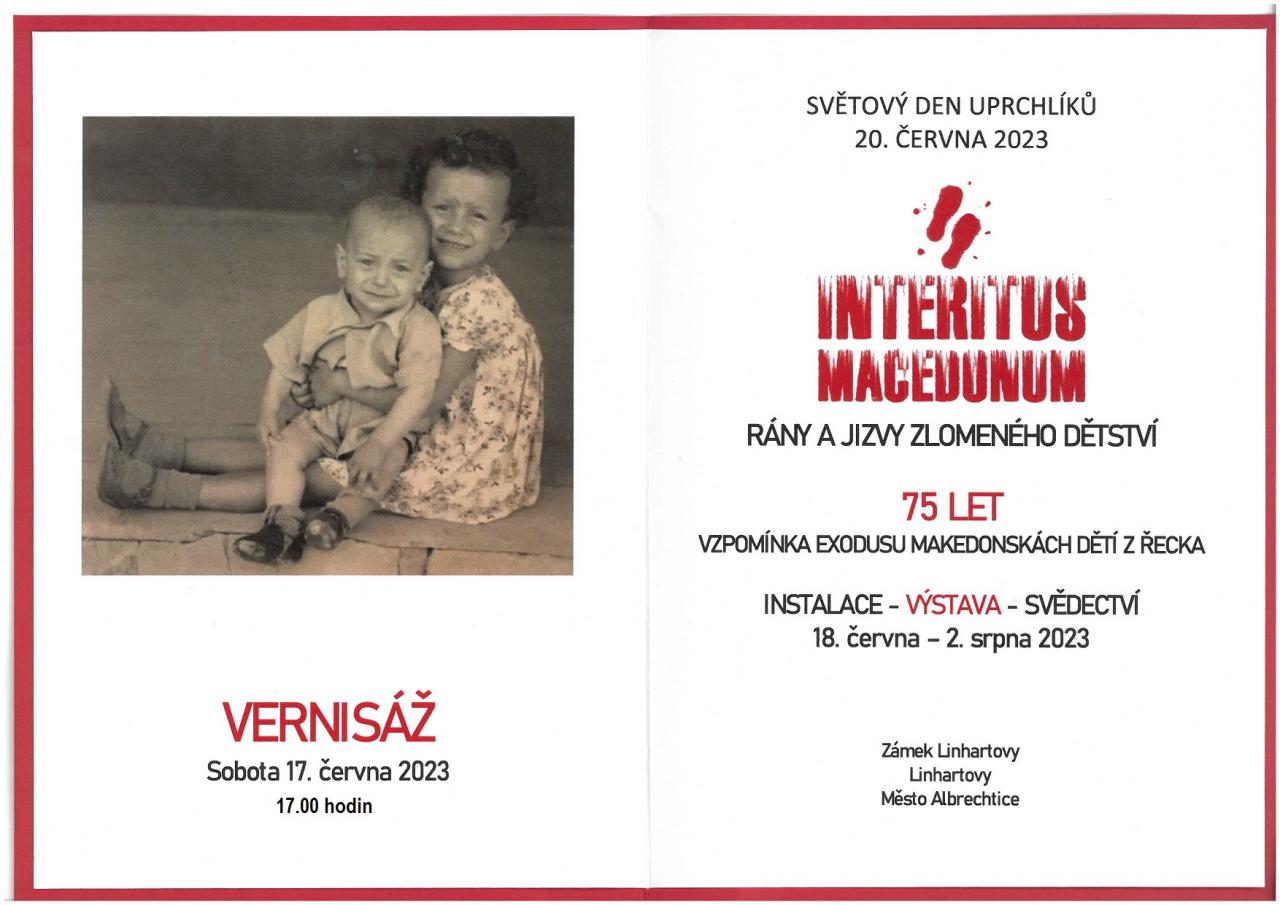 Dovolujeme si vás pozvat na vernisáž s recepcí s názvem Interitus Macedonum: rány a jizvy ze zlomeného dětství v rámci oslav Světového dne uprchlíků. Vernisáž se koná v sobotu 17. června od 17 hodin na zámku Linhartovy.