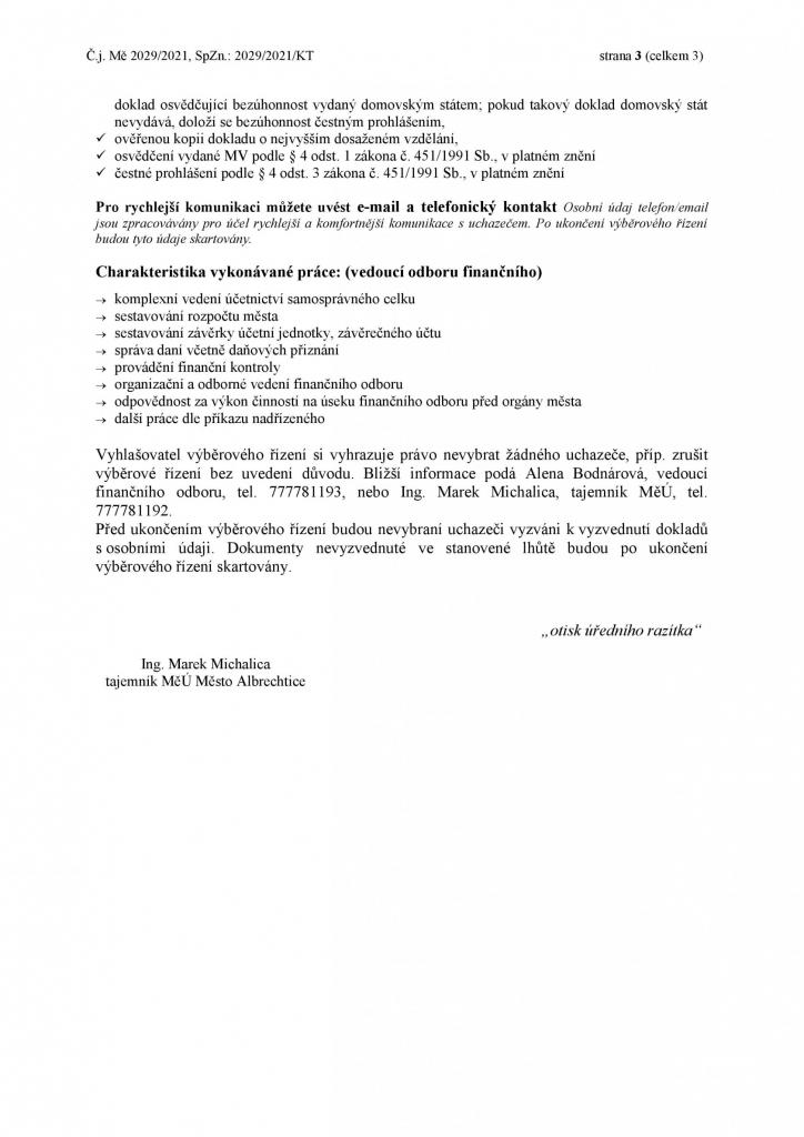 Městský úřad Město Albrechtice vyhlašuje výběrové řízení na obsazení pozice vedoucí finančního odboru.