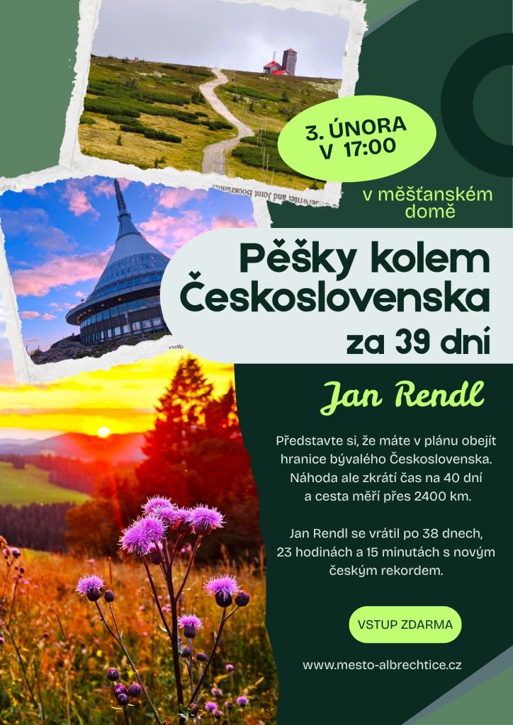 Zveme na přednášku Jana Rendla s názvem Pěšky kolem Československa za 39 dní. Přednáška se koná v úterý 3. února 2026 v 17 hodin v měšťanském domě. Vstup na přednášku je zdarma.
