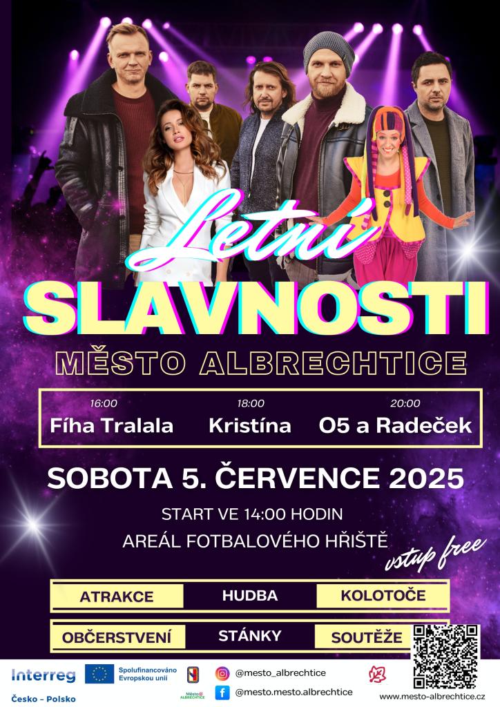 Léto v Městě Albrechticích odstartuje ve velkém stylu! Zveme vás na Letní slavnosti 2025, které nabídnou zábavu pro celou rodinu – odpoledne plné hudby, pohybu, her a letní atmosféry, kterou si nenecháte ujít. Akce se koná v sobotu 5. července od 14 hodin na fotbalovém hřišti FK. Vstup zdarma.