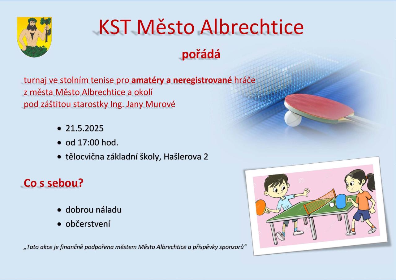 KST Město Albrechtice pořádá turnaj ve stolním tenise pro amatérské a neregistrované hráče z Města Albrechtic a okolí. Akce se koná pod záštitou starostky Ing. Jany Murové.