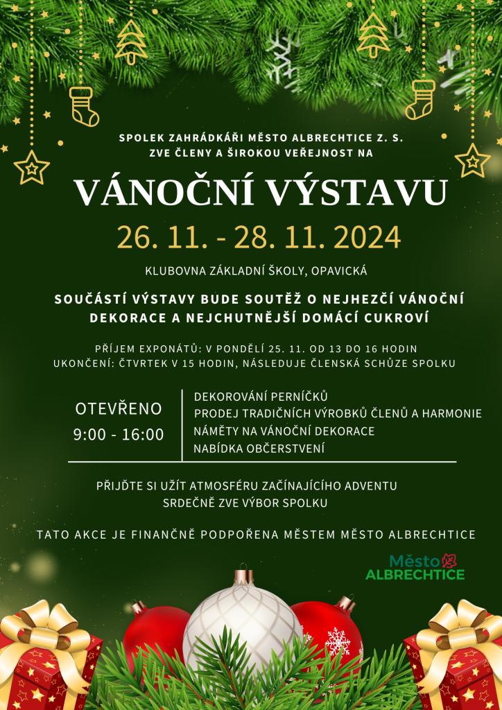 Spolek Zahrádkáři Město Albrechtice z.s. zve členy a širokou veřejnost na Vánoční výstavu, která se koná ve dnech 26. - 28. 11. od 9:00 do 16:00 hodin v klubovně ZŠ.